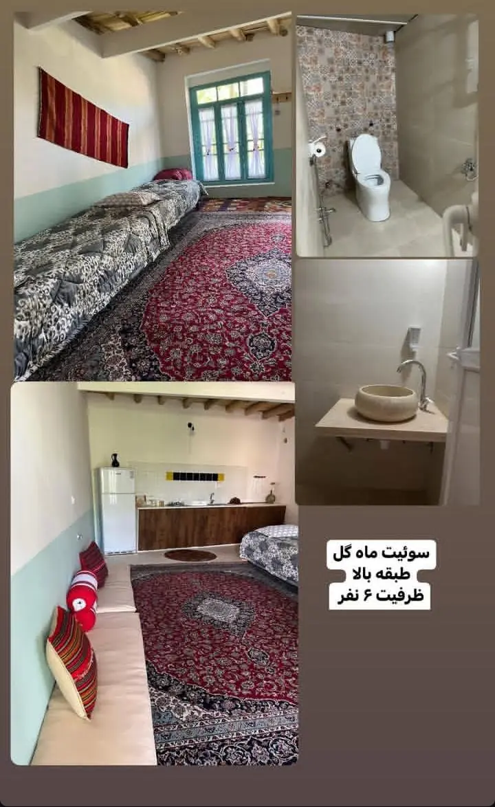 اتاقهایی با سرویس بهداشتی و حمام اختصاصی نیز موجود است؛ مثل اتاق دو تخته “ماه گل” اتاق ماه دخت ،ماه چهره و ماه پری که دارای توالت فرنگی میباشند .